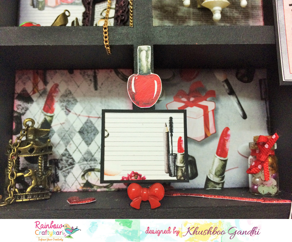 Papericious paper pack also has some beautiful shapes and motifs related to the theme like nail paint bottles, quotes, compact, lipstick, mascara, etc. I've used some of them here - on the front panel.